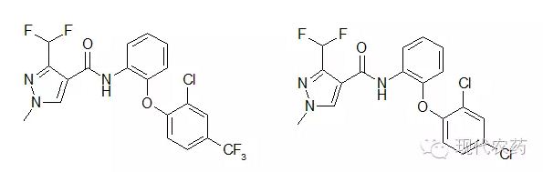 氟苯醚酰胺(试验代号Y13149)和氯苯醚酰胺(试验代号Y12196)是采用PFVS方法快速发现的新型琥珀酸脱氢酶抑制剂(SDHI),中国专利申请号201310502473.7,国际PCT专利:PCT/CN2013/089220。两者均具有内吸传导性,且耐雨水冲淋,用量较低(亩用量在5~7 g)。目前两品种已转让给燕化永乐生物科技股份有限公司进行产业化开发,且已进入登记阶段。