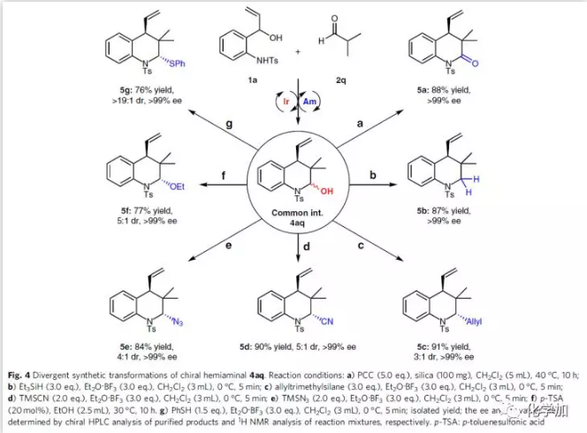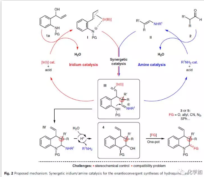 作者推测可能的机理(Fig. 2):首先,Ir-催化剂与乙烯基氨基醇1a反应合成含Ir的偶极中间体I,同时胺催化剂与醛结合生成烯胺中间体II。然后,中间体I和中间体II反应生成的中间体III会依次发生分子内环化反应(III→IV)和酸促进的水解反应(IV→4)生成半缩醛4。最后,4可通过羟基原位转化的方式转化为各种取代的二氢喹啉酮和四氢喹啉(4→3/5)。该方法理论上是可行的,但作者仍需解决构建两个相邻季碳手性中心的手性控制问题以及催化剂、底物和添加物之间的相容性问题。