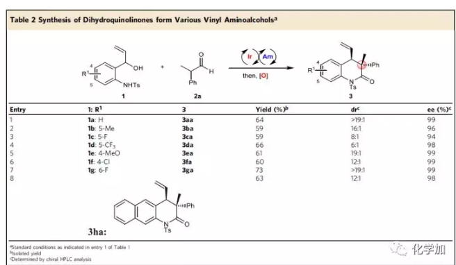 在最优反应条件下,作者对乙烯基氨基醇的底物范围进行了考察(Table 2)。各种4位-、5位-和6位-苯基取代的乙烯基氨基醇均能较好的适应反应条件,能以良好的收率、优秀的对映选择性和良好至优秀的非对映选择性得到相应产物。萘基取代的烯丙基醇也具有良好的耐受性,能以良好的收率、优秀的的对映选择性和非对映选择性得到相应产物。