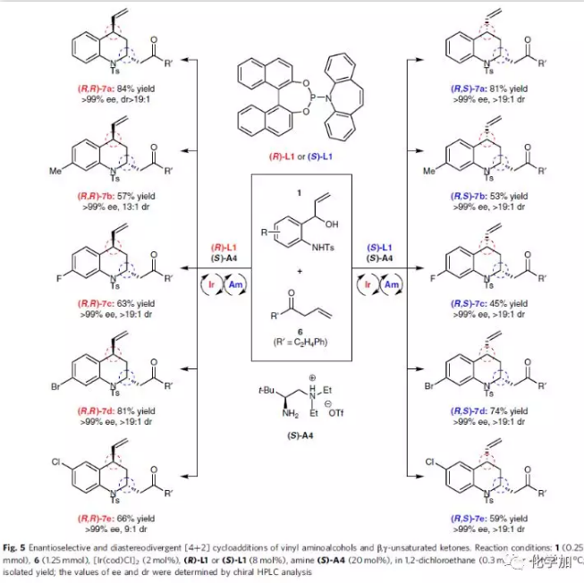 胺催化剂除了能活化α-二取代的醛之外,还可通过与β,γ-不饱和酮的γ-位置形成二烯胺从而活化底物。因此,作者进一步探讨了乙烯基氨基醇1a与β,γ-不饱和酮6的不对称[4+2]环加成反应的最优反应条件和底物范围。在罗氏伯胺催化剂(S)-A4和Carreira的手性亚磷酰胺配体(R)-L1或(S)-L1的催化作用下,该反应能分别以良好的收率、优异的对映选择性和非对映选择性得到两种非对映异构体。其中,(R,S)-7a的绝对构型通过单晶予以确证。受到上述结果的鼓舞,作者紧接着又对乙烯基氨基醇的底物范围进行了考察(Fig. 5)。各种4位-和5位-苯基取代的乙烯基氨基醇均能较好的适应反应条件,分别能以良好的收率、优秀的对映选择性和非对映选择性得到两种非对映异构体。