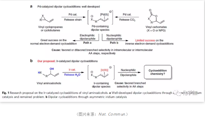 杂环化合物广泛存在于药物化学、农业化学、材料化学和生命科学中,因此该化合物的合成成为化学家们关注的重点。过渡金属(如Pd)催化含过渡金属的偶极中间体的不对称环加成反应已被证明是合成杂环化合物最有力的策略之一,其中较为常见的是含Pd的偶极中间体与亲电的偶极试剂发生常规电子需求的环加成反应。Pd-催化分子间的烯丙基烷基化反应则可突破常规方法,实现分子间反电子需求的环加成反应,但该方法往往存在底物局限或需要加入共催化剂等问题(Fig. 1a)。因此,开发新的反电子需求的不对称环加成反应仍然是化学家们亟待解决的问题。考虑到Ir-催化的烯丙基烷基化反应可表现出优异的支链选择性以及Ir-催化剂与其它催化剂具有良好的相容性等优点,华中师范大学陆良秋和肖文精团队报道了Ir-和胺催化剂共同催化乙烯基氨基醇和醛或β,γ-不饱和酮的不对称[4+2]环加成反应,能以良好的收率、良好至优秀的对映选择性和非对映选择性得到一系列具有光学活性的二氢喹啉酮和四氢喹啉(Fig. 1b)。