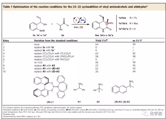 以乙烯基氨基醇1a和醛2a作为模板底物,作者对该反应条件进行了反复筛选,确定最优条件:4 mol% Ir-催化剂(2 mol% [Ir(cod)Cl]2和8 mol%配体L1)和20 mol%胺催化剂A1为共催化剂,0.5 equiv CCl3CO2H和H2O为添加物,1,2-二氯乙烷为溶剂,在室温条件下反应48小时,能以92%的收率得到半缩醛4aa。4aa可被PCC氧化,能以67%的收率、99%的对映选择性和>19:1的非对映选择性得到二氢喹啉酮3aa(Table 1)。